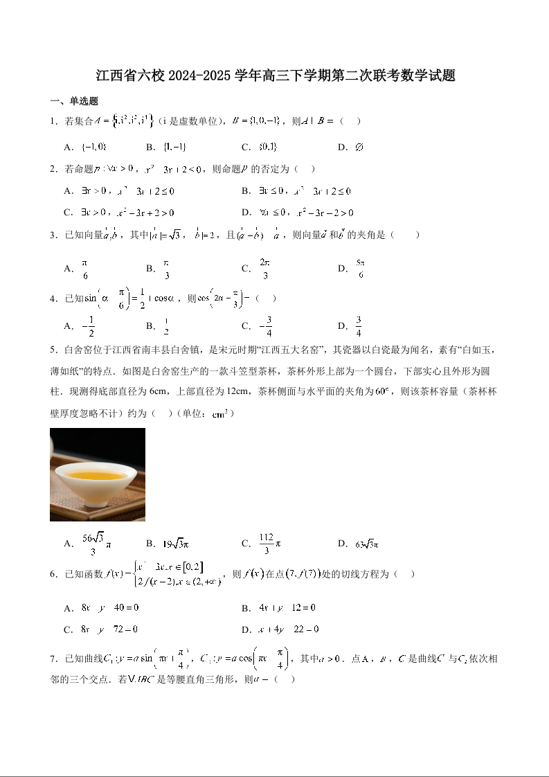 江西省六校2024-2025学年下学期3月高三第二次联考数学+答案