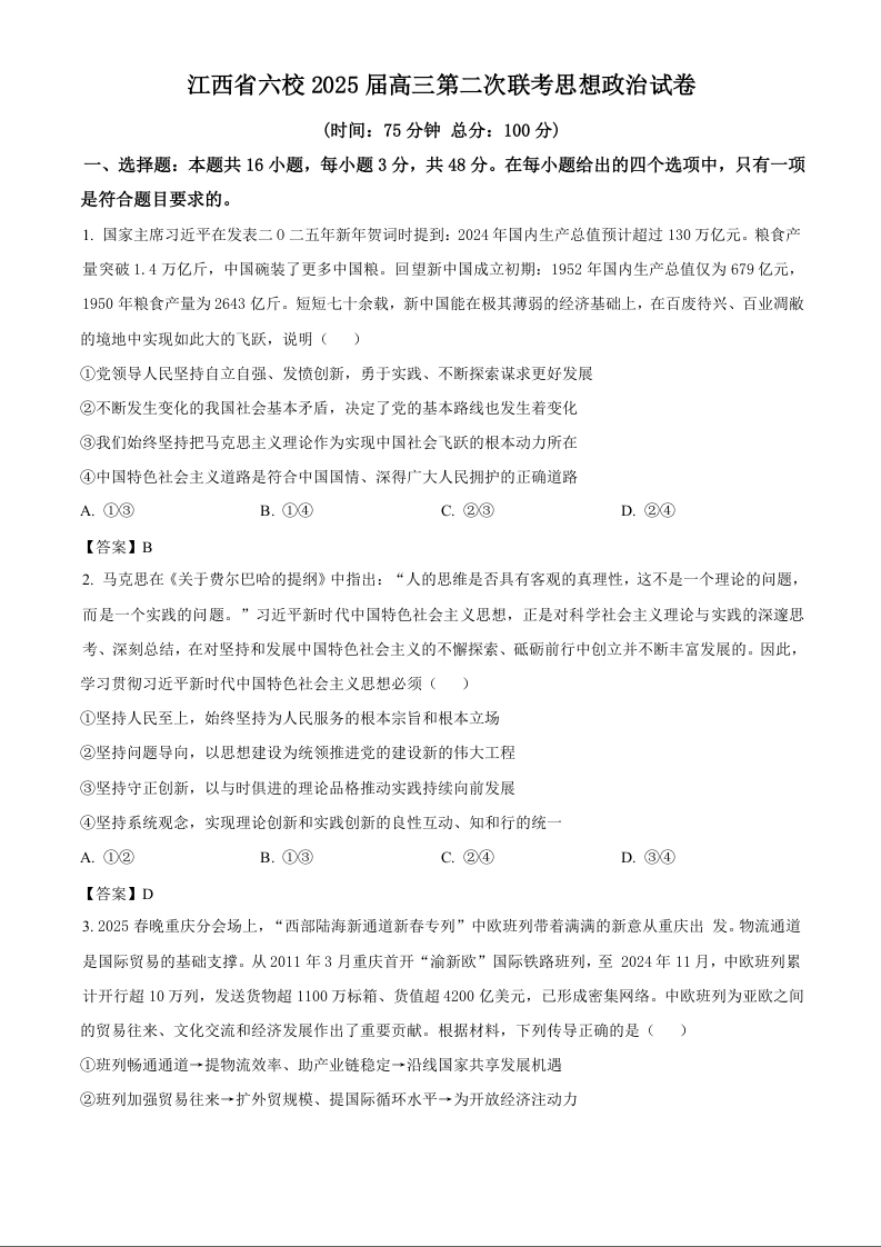 江西省六校2024-2025学年下学期3月高三第二次联考政治(答案版)