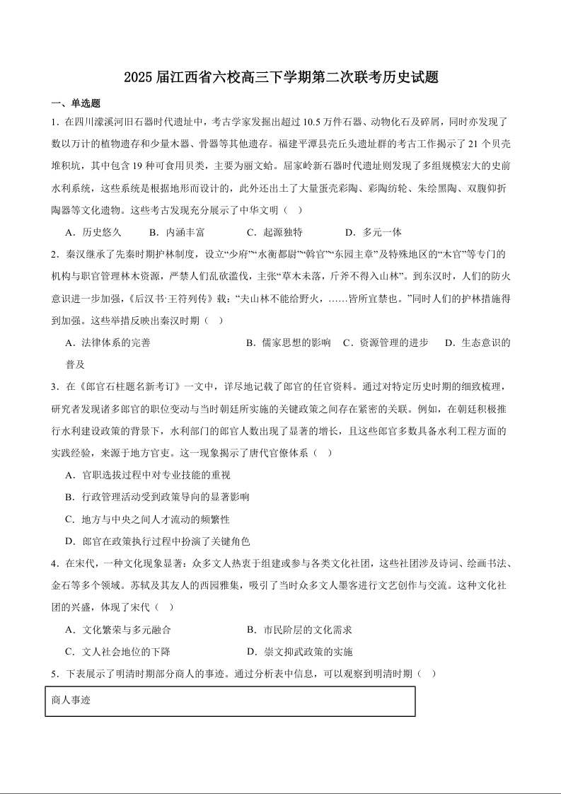 江西省六校2024-2025学年下学期3月高三第二次联考历史+答案