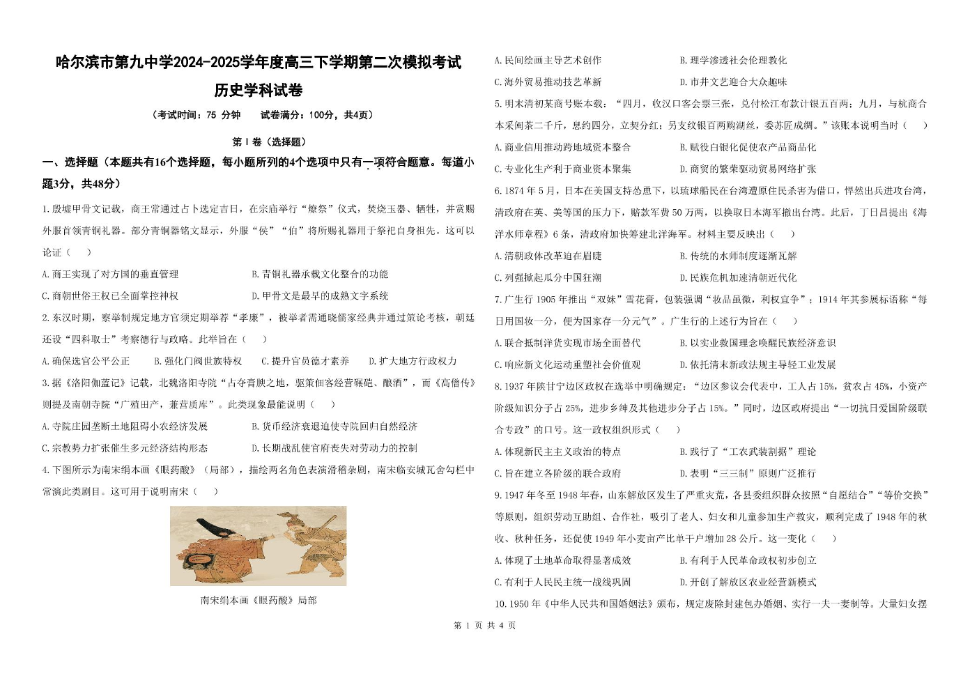黑龙江省哈尔滨市九中2024-2025学年下学期高三第二次模拟考试历史
