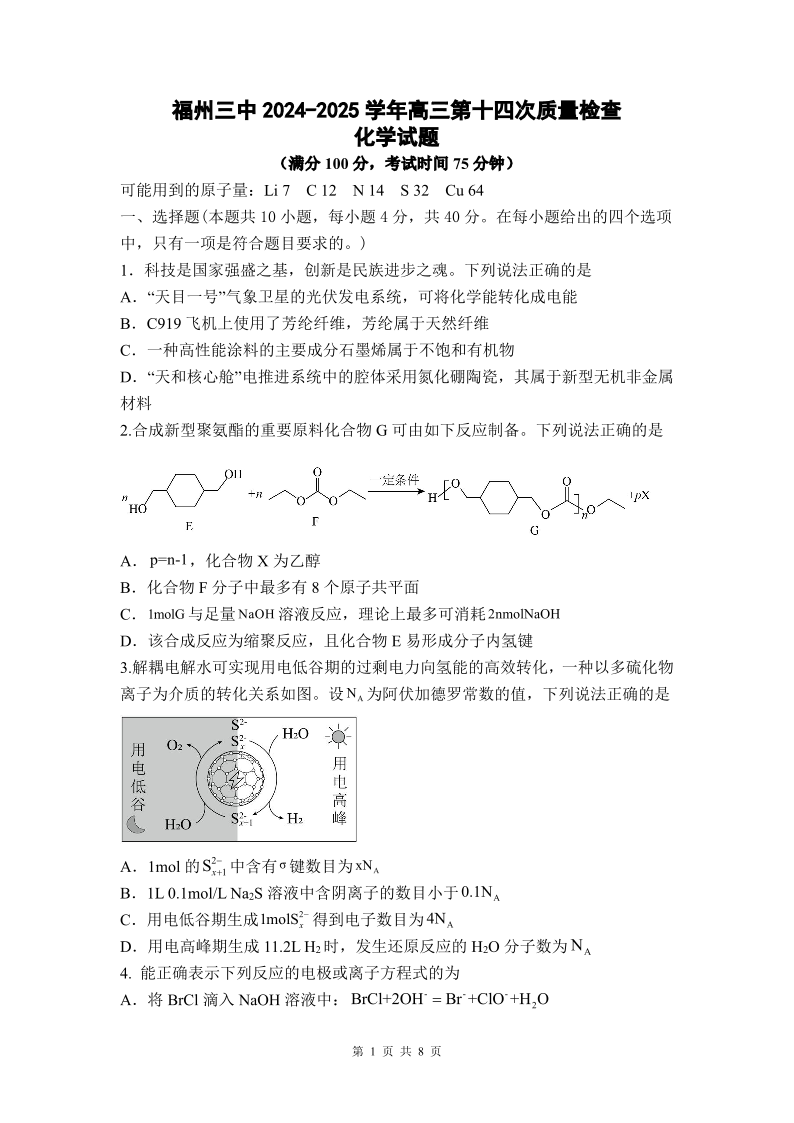 福建省福州市三中2024-2025学年下学期高三第十四次质量检测化学