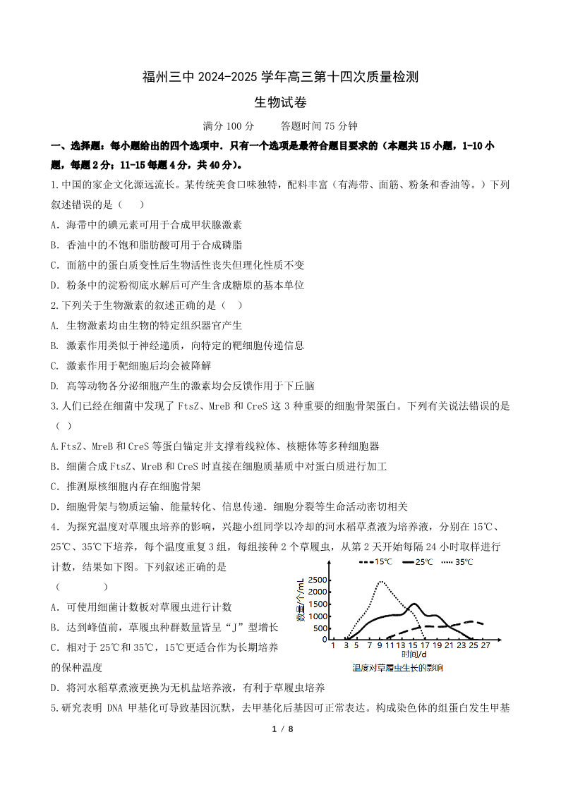 福建省福州市三中2024-2025学年下学期高三第十四次质量检测生物