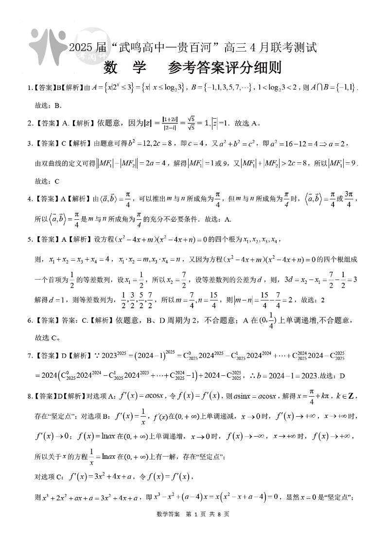 广西省“武鸣高中-贵百河”2024-2025学年下学期4月高三联考测试数学答案