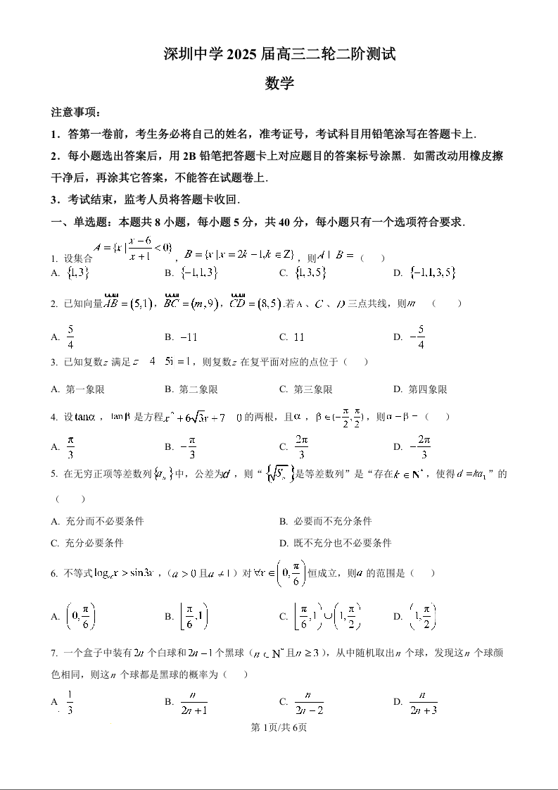 广东省深圳中学2024-2025学年下学期高三二轮二阶测试数学+答案