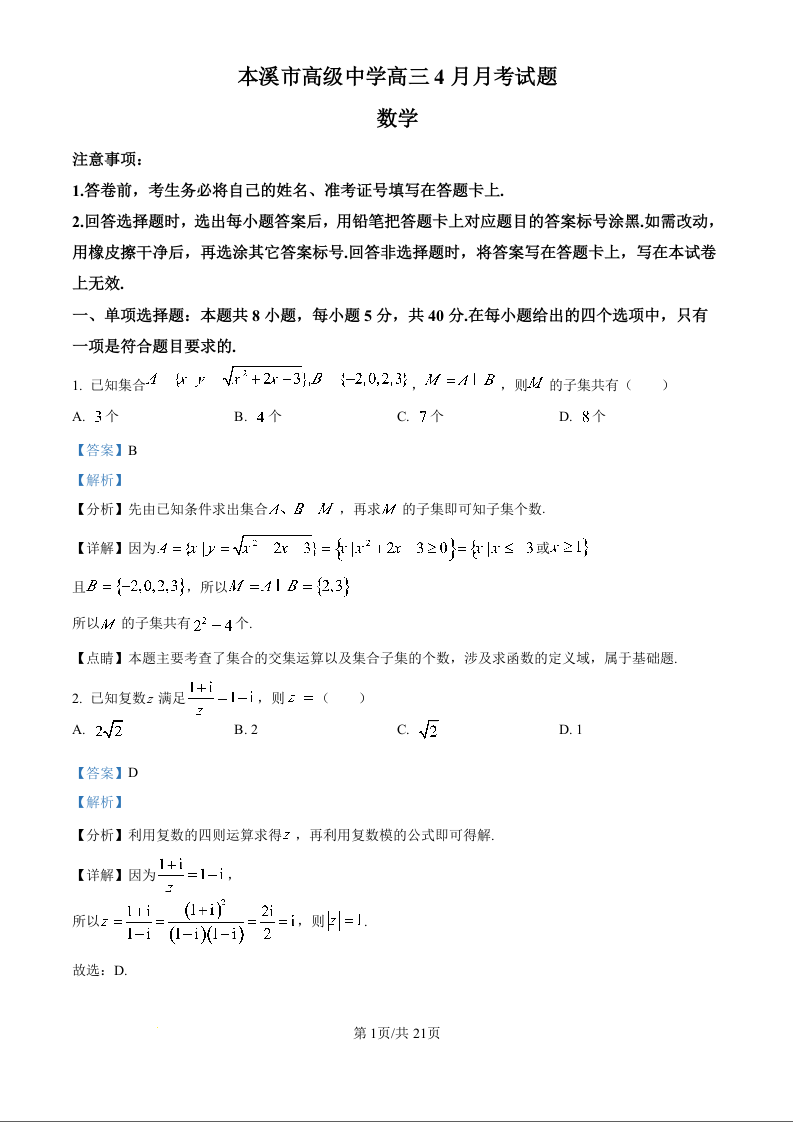辽宁省本溪市高级中学2024-2025学年下学期4月高三月考数学(解析版)