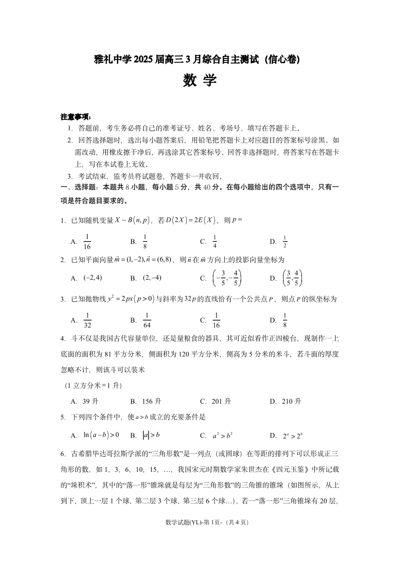 湖南省雅礼中学2024-2025学年下学期3月高三综测(信心卷)数学