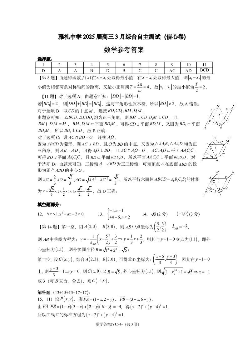 湖南省雅礼中学2024-2025学年下学期3月高三综测(信心卷)数学答案