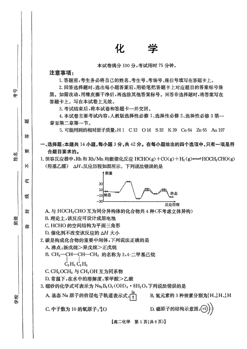 河南省安鹤新联盟2024-2025学年下学期3月高二联考化学+答案