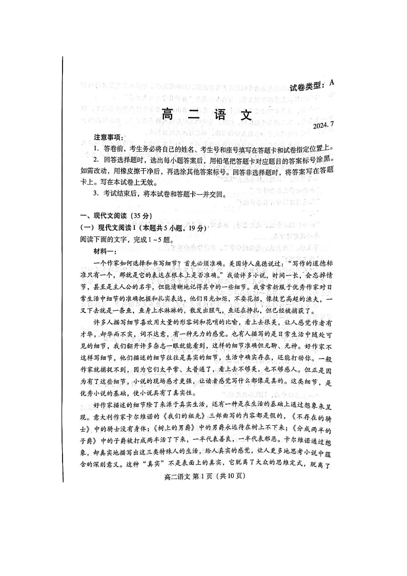 山东省潍坊市高2025届下学期7月期末学习质量检测语文