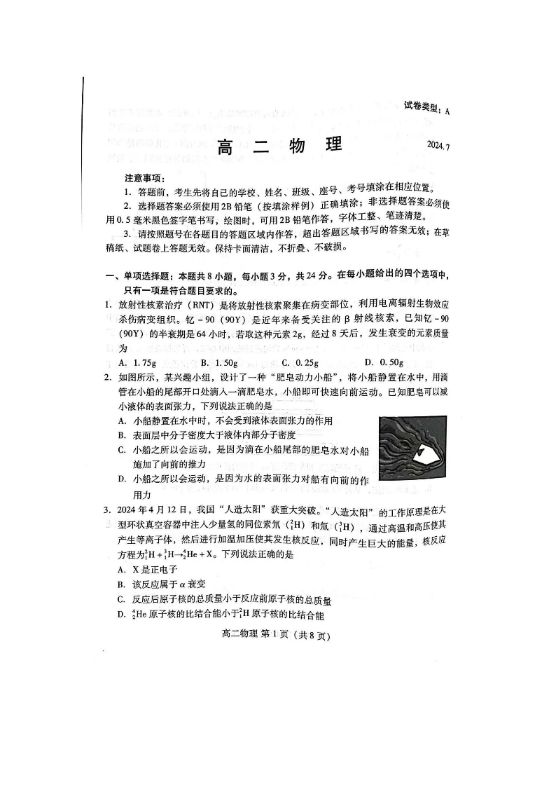 山东省潍坊市高2025届下学期7月期末学习质量检测物理