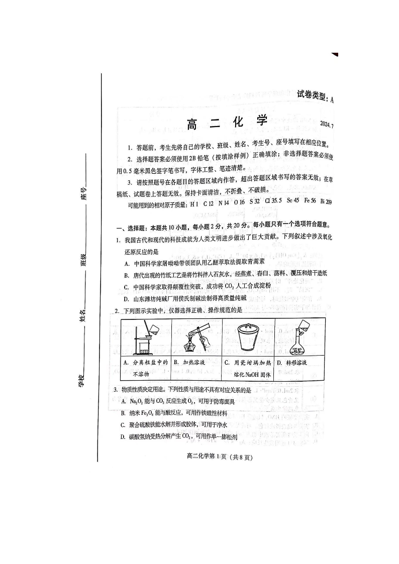 山东省潍坊市高2025届下学期7月期末学习质量检测化学