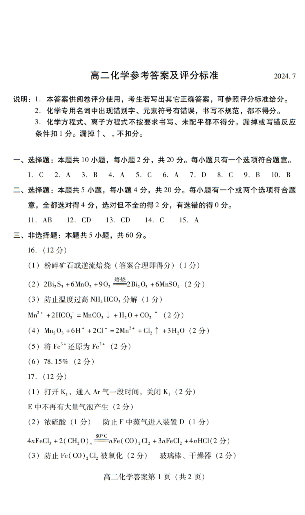 山东省潍坊市高2025届下学期7月期末学习质量检测化学答案