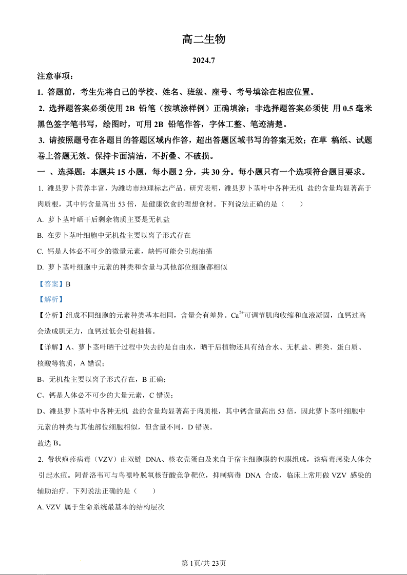 山东省潍坊市高2025届下学期7月期末学习质量检测生物(精品解析版)