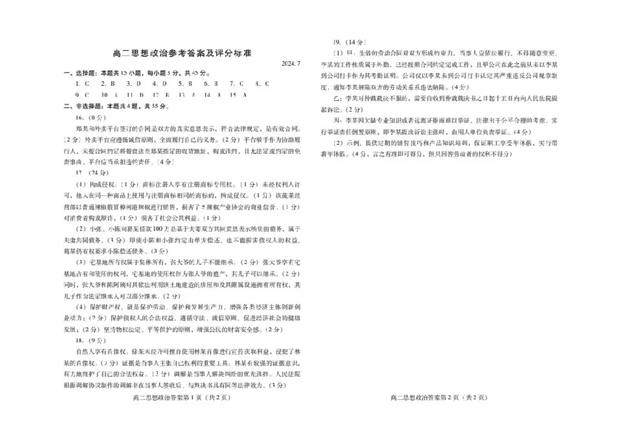 山东省潍坊市高2025届下学期7月期末学习质量检测政治答案