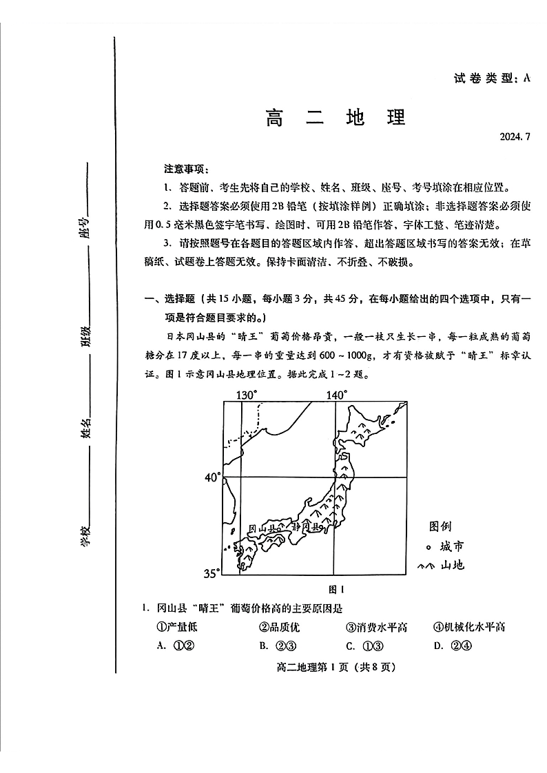 山东省潍坊市高2025届下学期7月期末学习质量检测地理