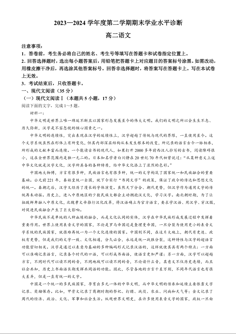 山东省烟台市高2025届下学期7月期末考试语文+答案