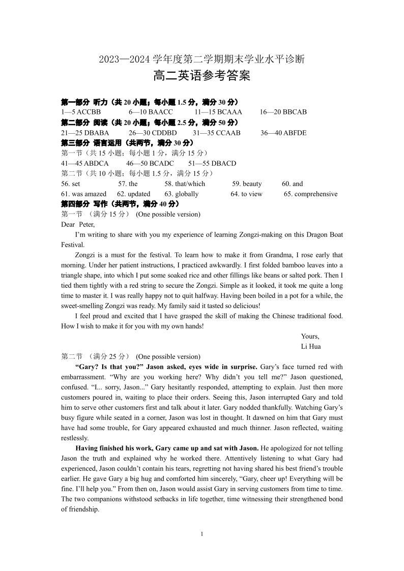 山东省烟台市高2025届下学期7月期末考试英语答案