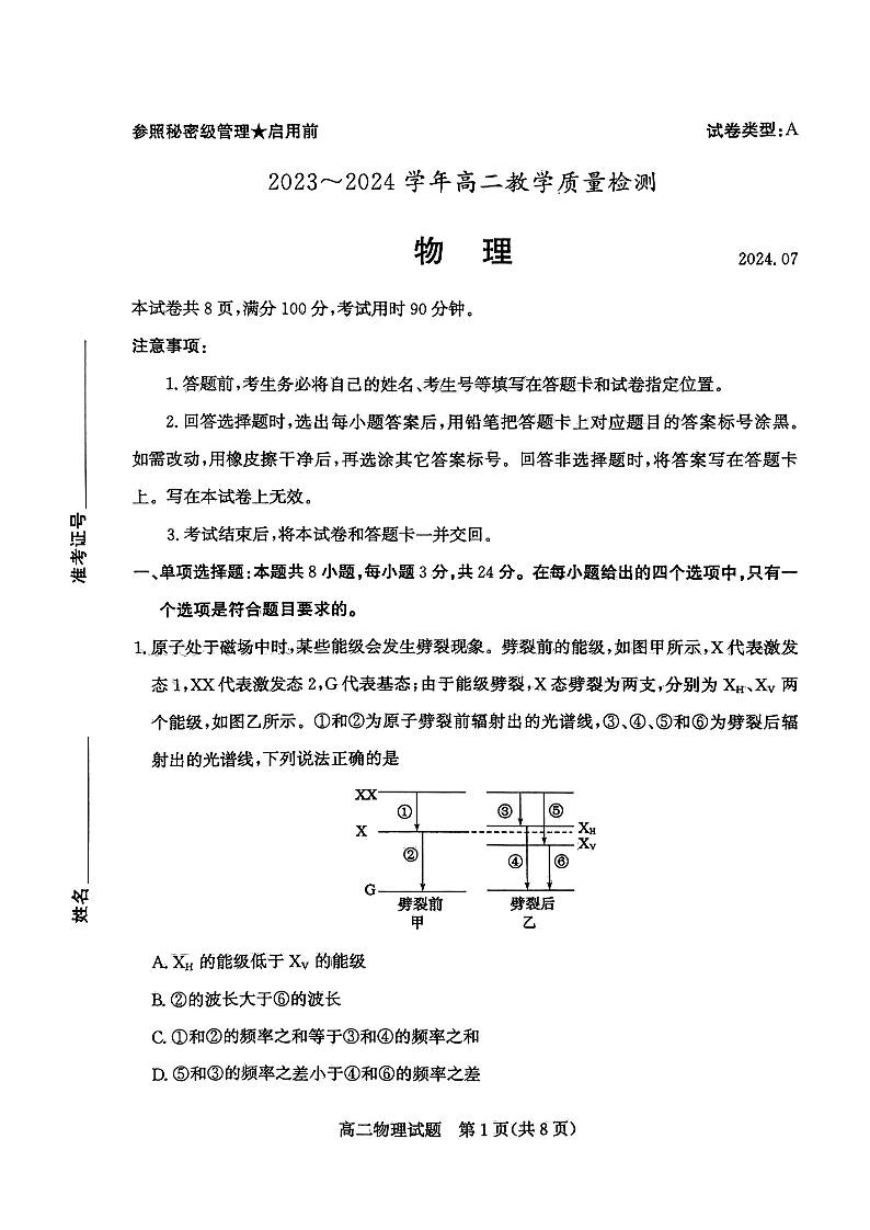 山东省枣庄市高2025届期末教学质量检测物理