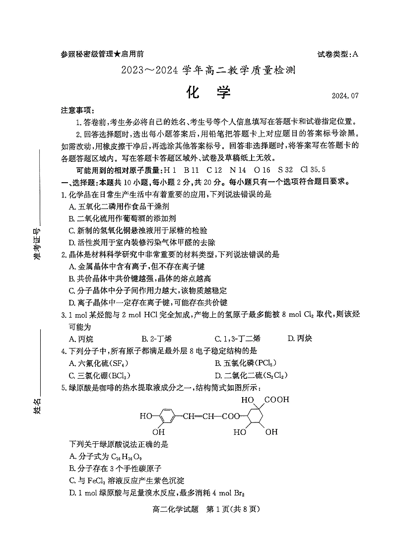 山东省枣庄市高2025届期末教学质量检测化学