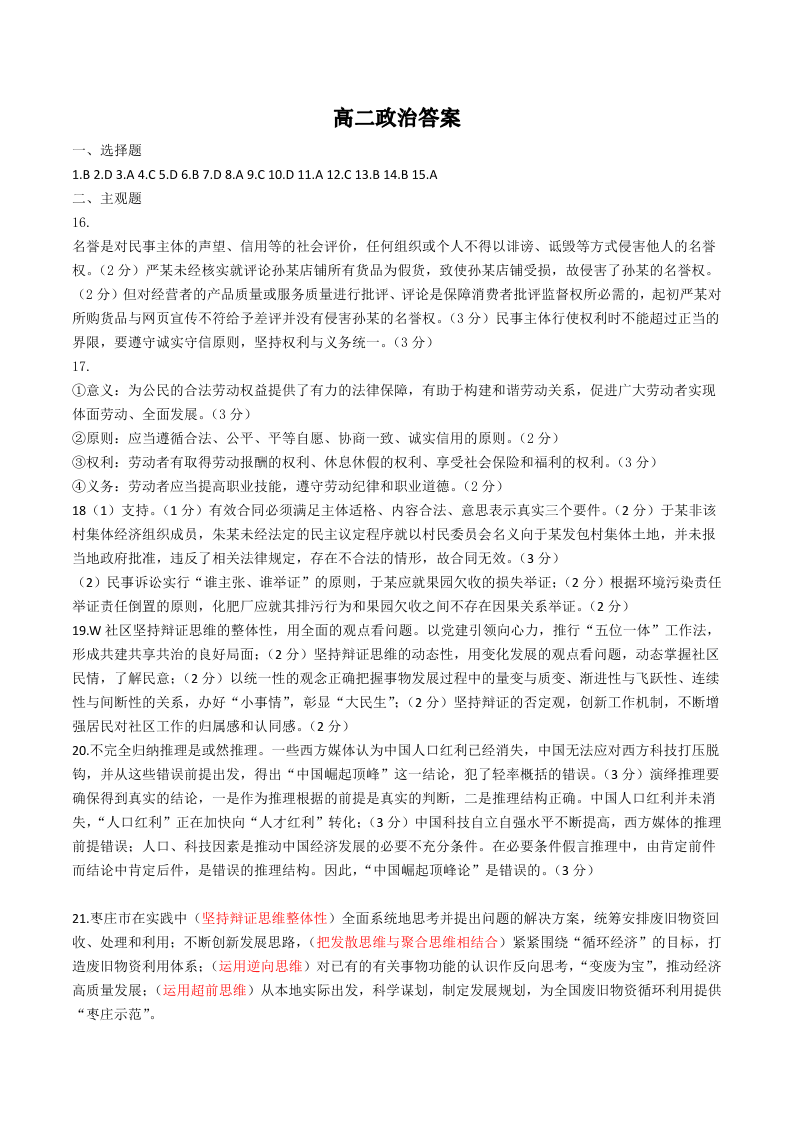 山东省枣庄市高2025届期末教学质量检测政治答案