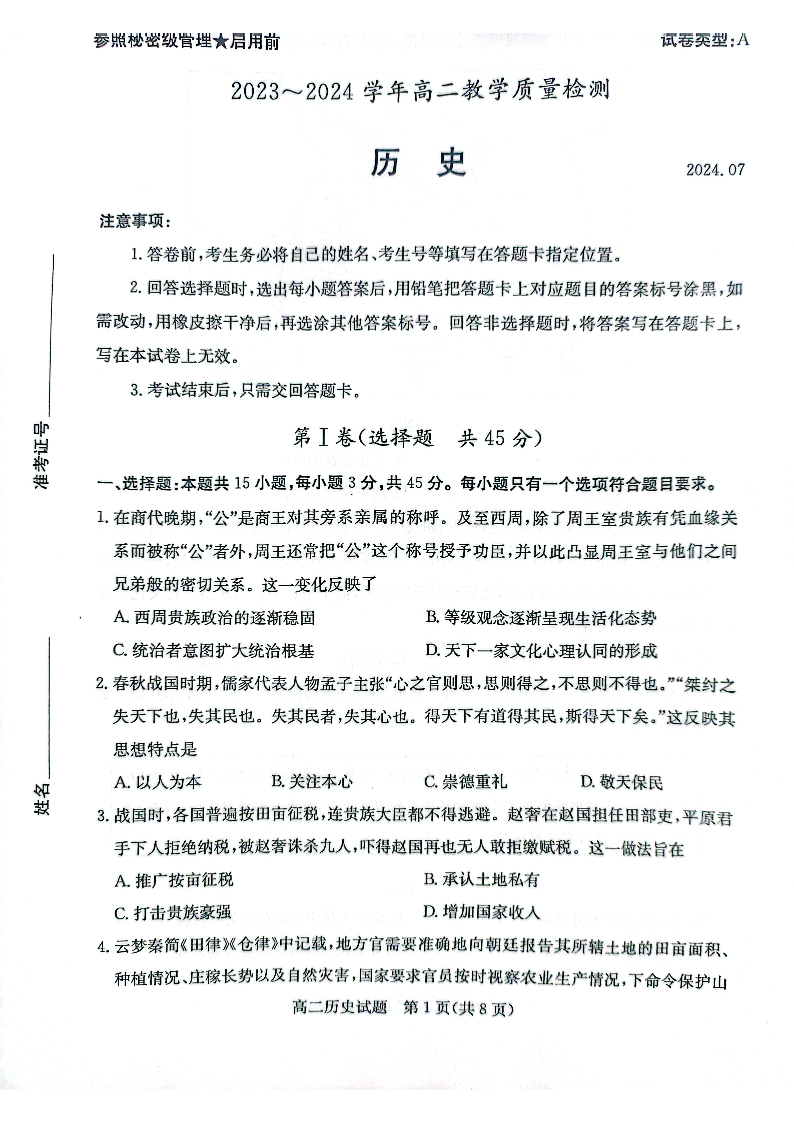 山东省枣庄市高2025届期末教学质量检测历史