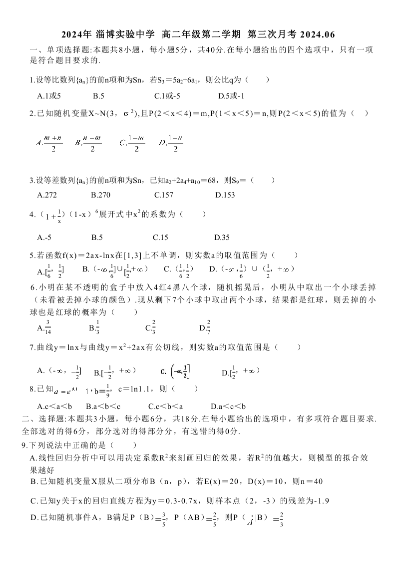 山东省淄博实验中学高二下学期6月月考(第三次月考)数学+答案