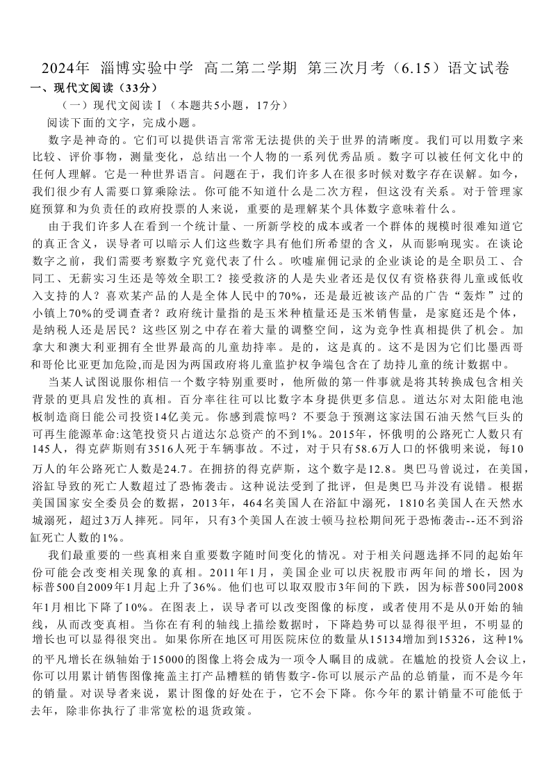 山东省淄博实验中学高二下学期6月月考(第三次月考)语文+答案