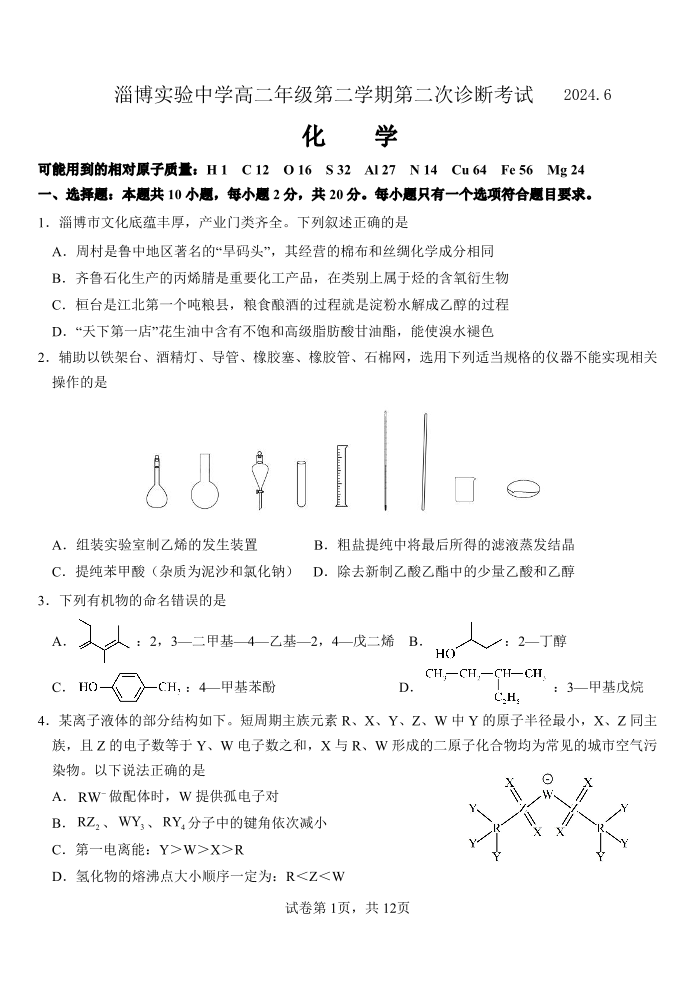 山东省淄博实验中学高二下学期6月月考(第三次月考)化学+答案