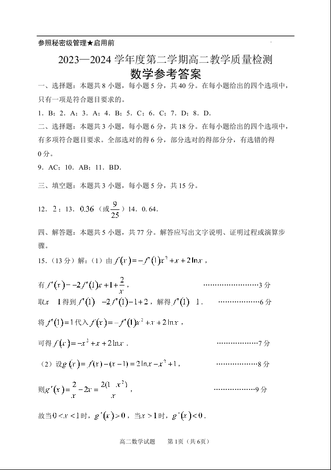 山东省淄博市高2025届高二下学期教学质量检测数学答案