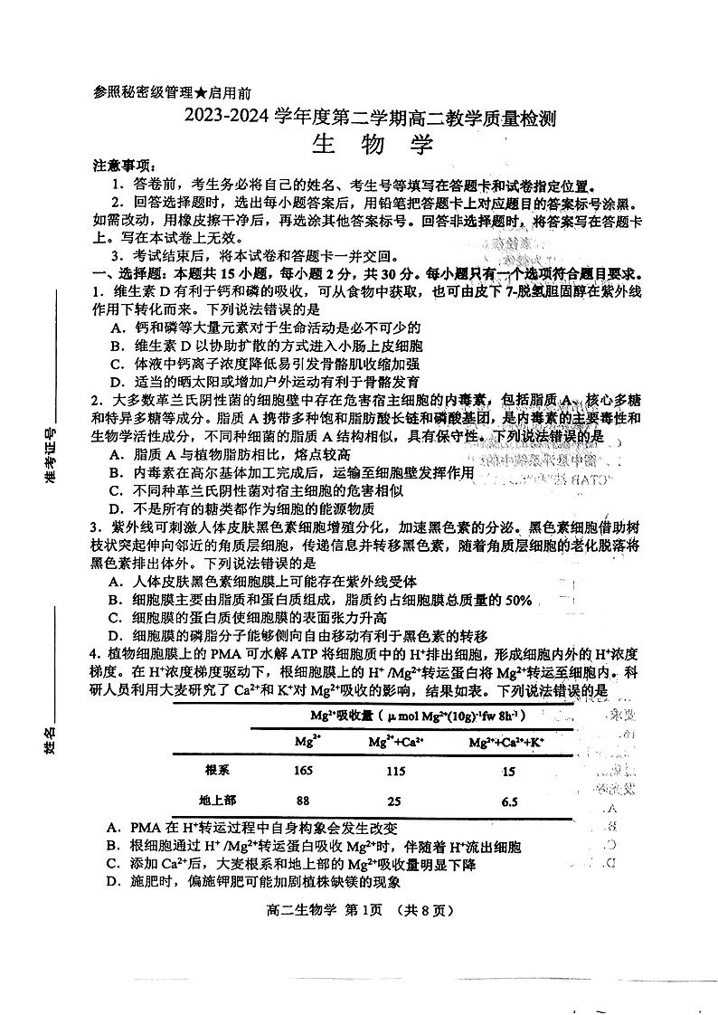 山东省淄博市高2025届高二下学期教学质量检测生物