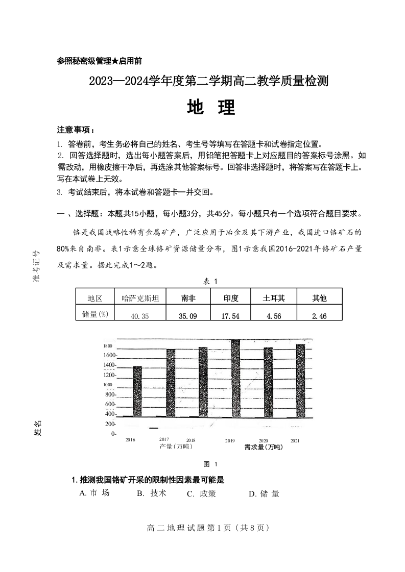 山东省淄博市高2025届高二下学期教学质量检测地理