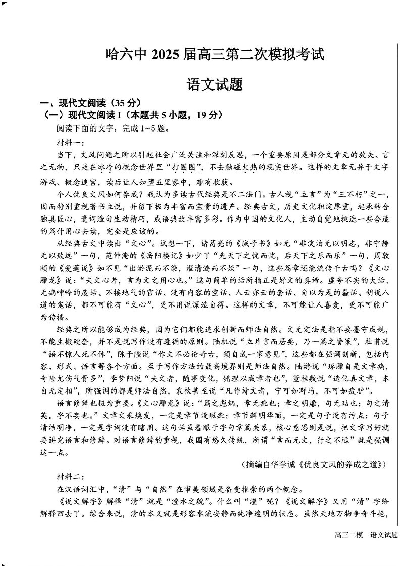 黑龙江省哈尔滨市六中2024-2025学年下学期高三第二次模拟考试语文+答案