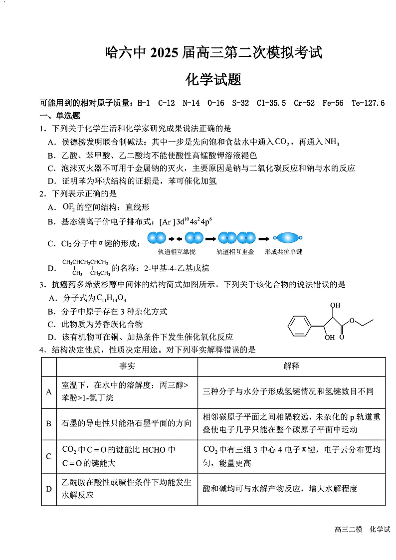 黑龙江省哈尔滨市六中2024-2025学年下学期高三第二次模拟考试化学+答案