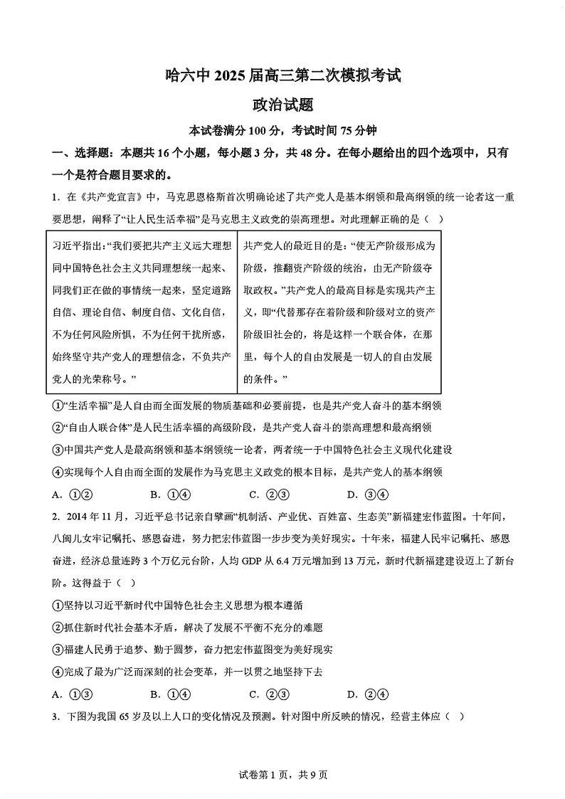 黑龙江省哈尔滨市六中2024-2025学年下学期高三第二次模拟考试政治+答案