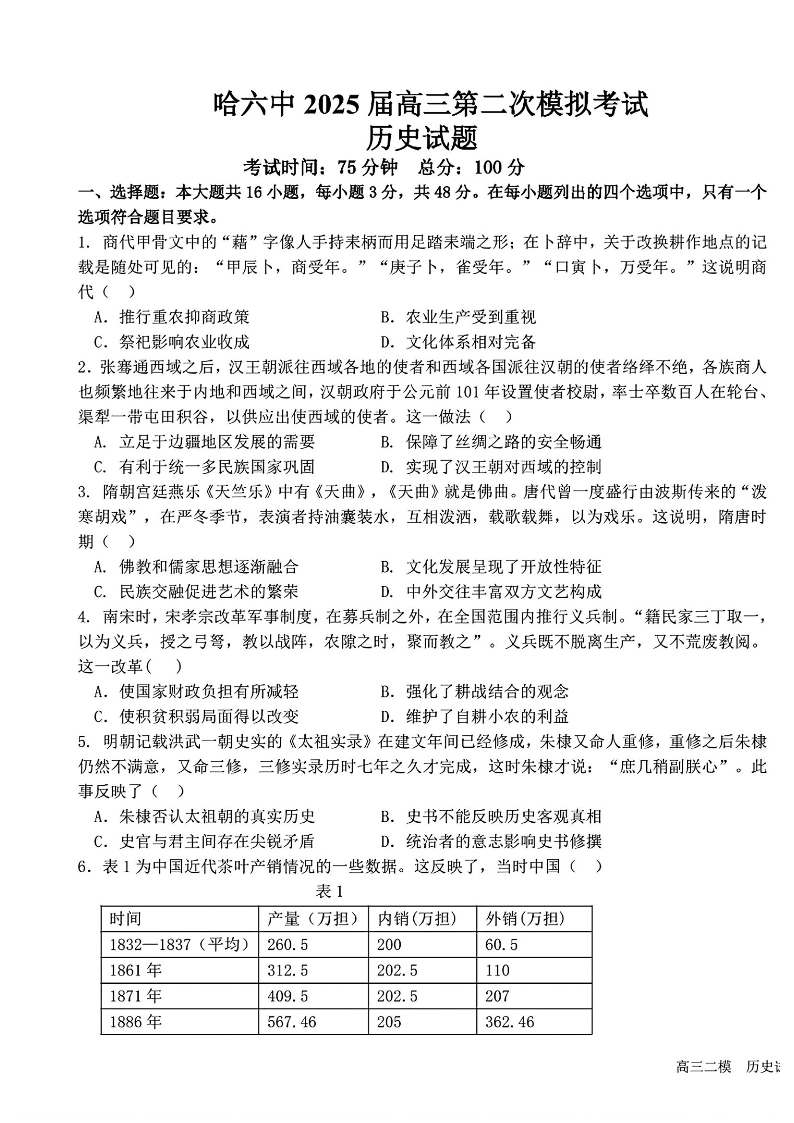 黑龙江省哈尔滨市六中2024-2025学年下学期高三第二次模拟考试历史+答案