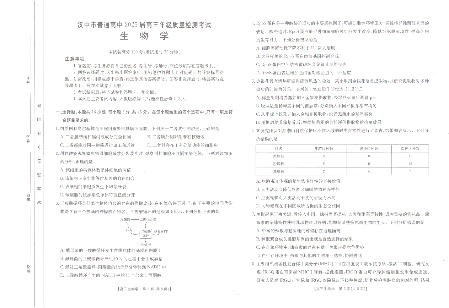 陕西省汉中市2024-2025学年下学期高三二模质量检测考试生物+答案