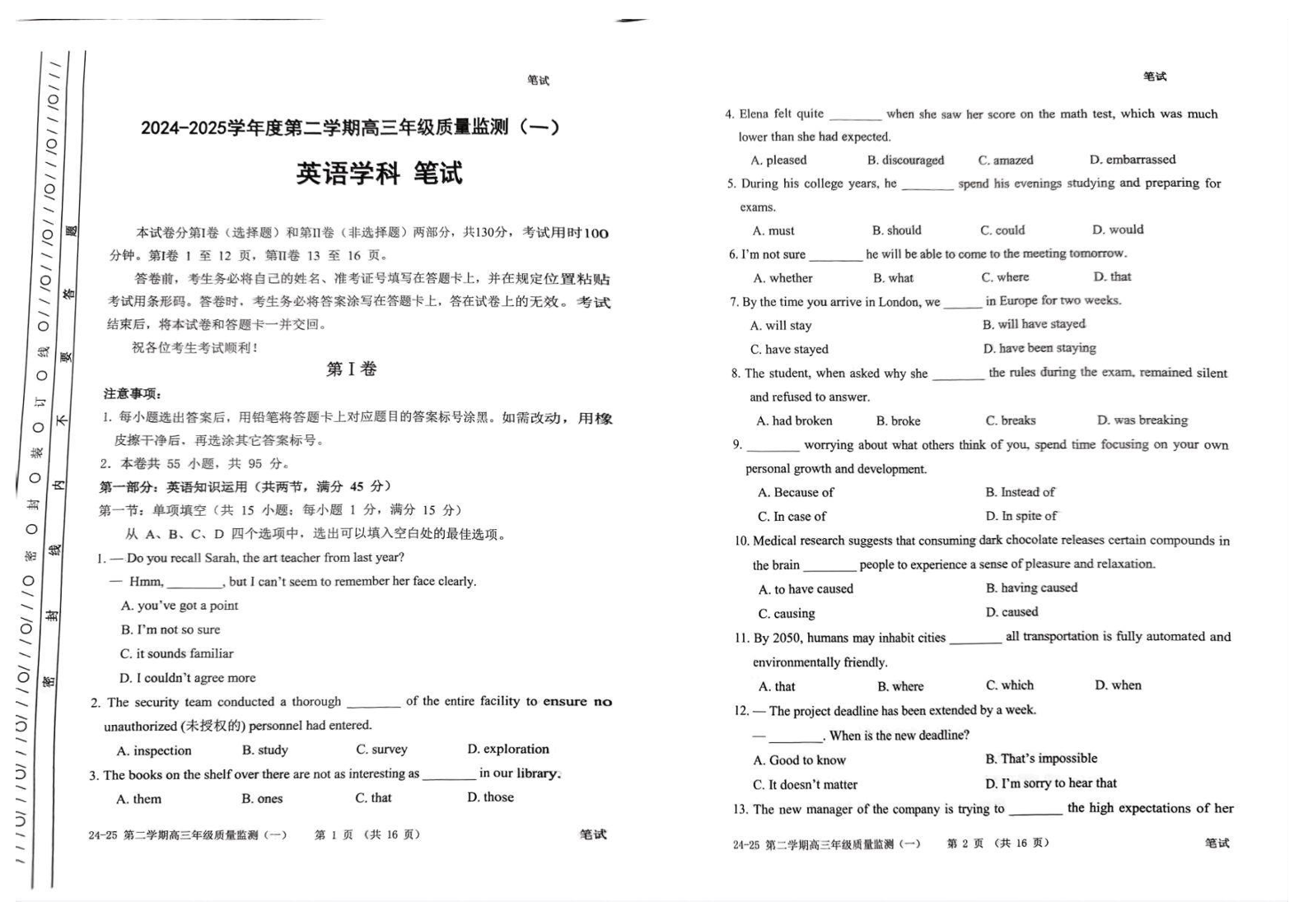 天津市南开区2024-2025学年第二学期高三质量监测(一)英语