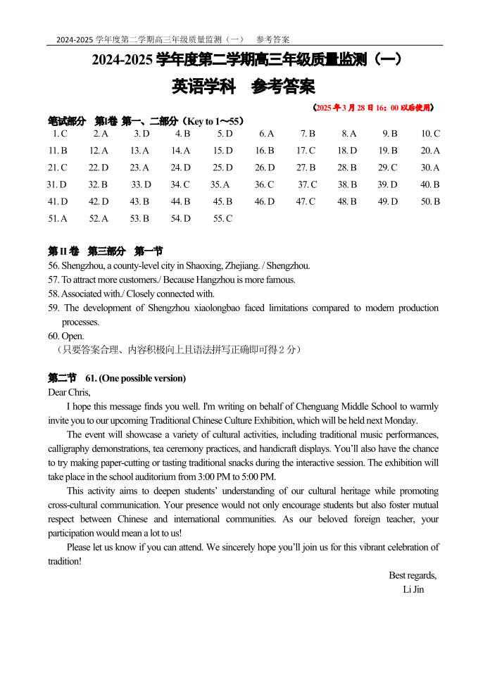 天津市南开区2024-2025学年第二学期高三质量监测(一)英语答案