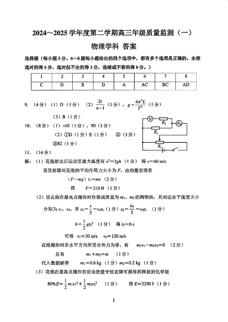 天津市南开区2024-2025学年第二学期高三质量监测(一)物理答案