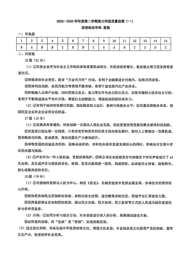 天津市南开区2024-2025学年第二学期高三质量监测(一)政治答案