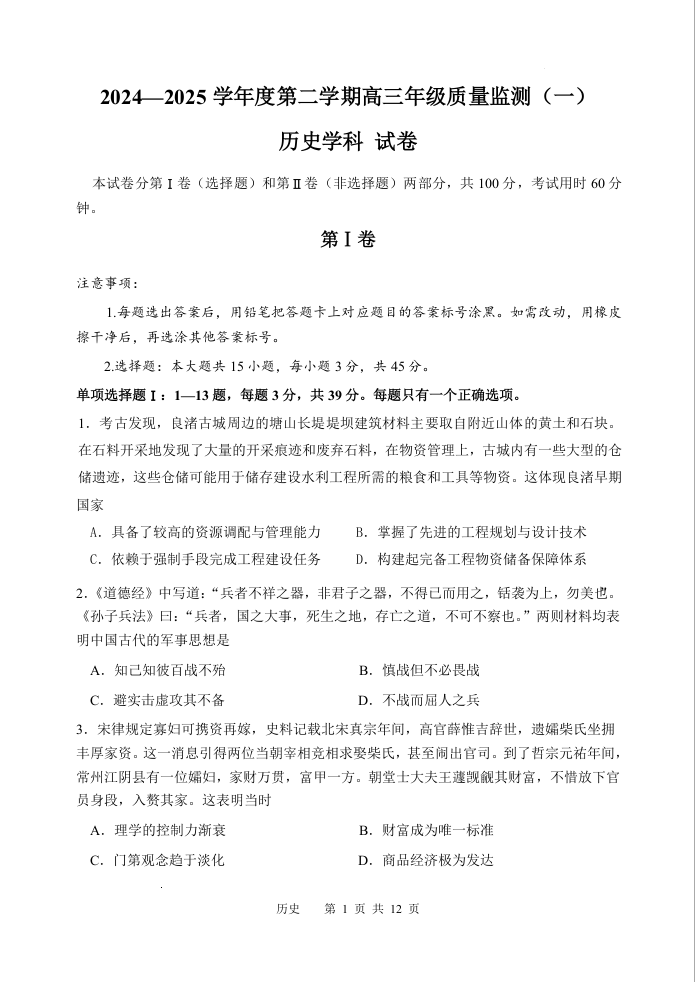 天津市南开区2024-2025学年第二学期高三质量监测(一)历史+答案