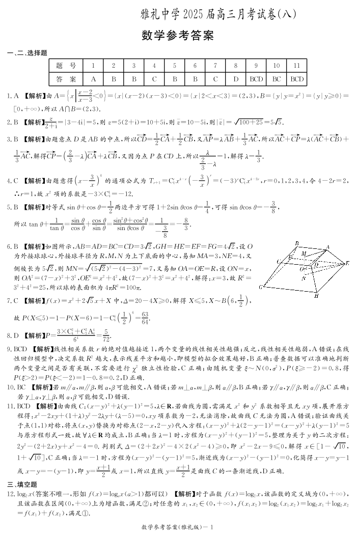 湖南省长沙市雅礼中学2024-2025学年下学期高三月考(八)数学答案