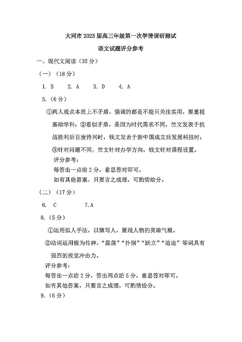 山西省大同市2025届高三年级第一次学情调研语文答案