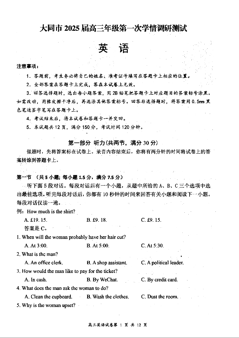 山西省大同市2025届高三年级第一次学情调研英语