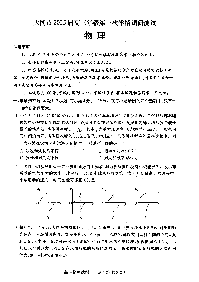 山西省大同市2025届高三年级第一次学情调研物理