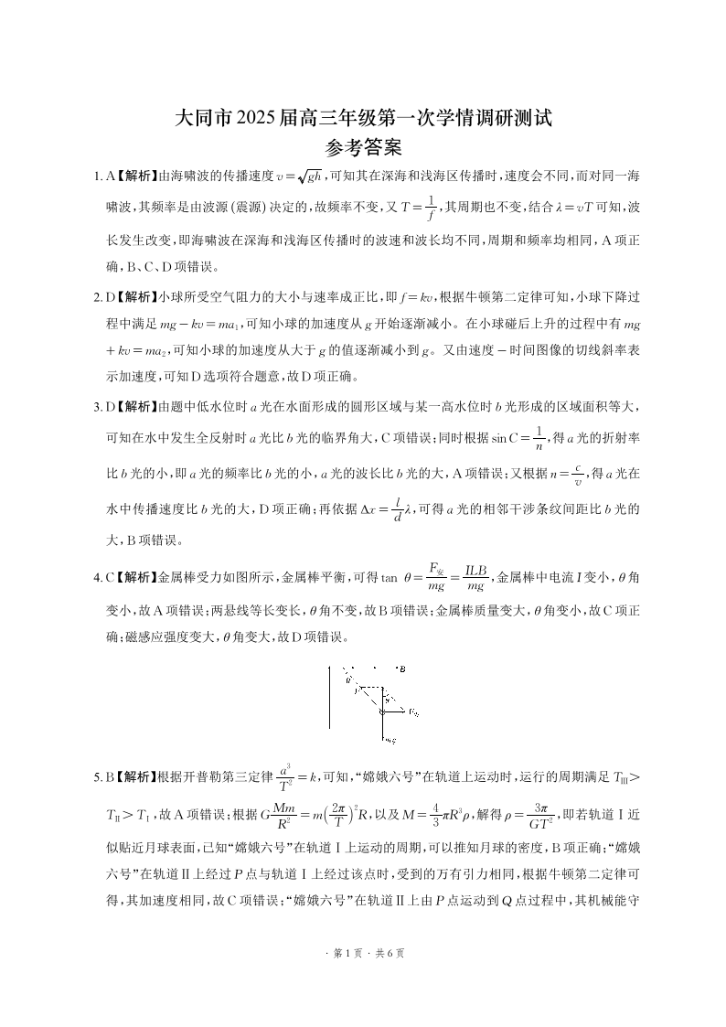 山西省大同市2025届高三年级第一次学情调研物理答案