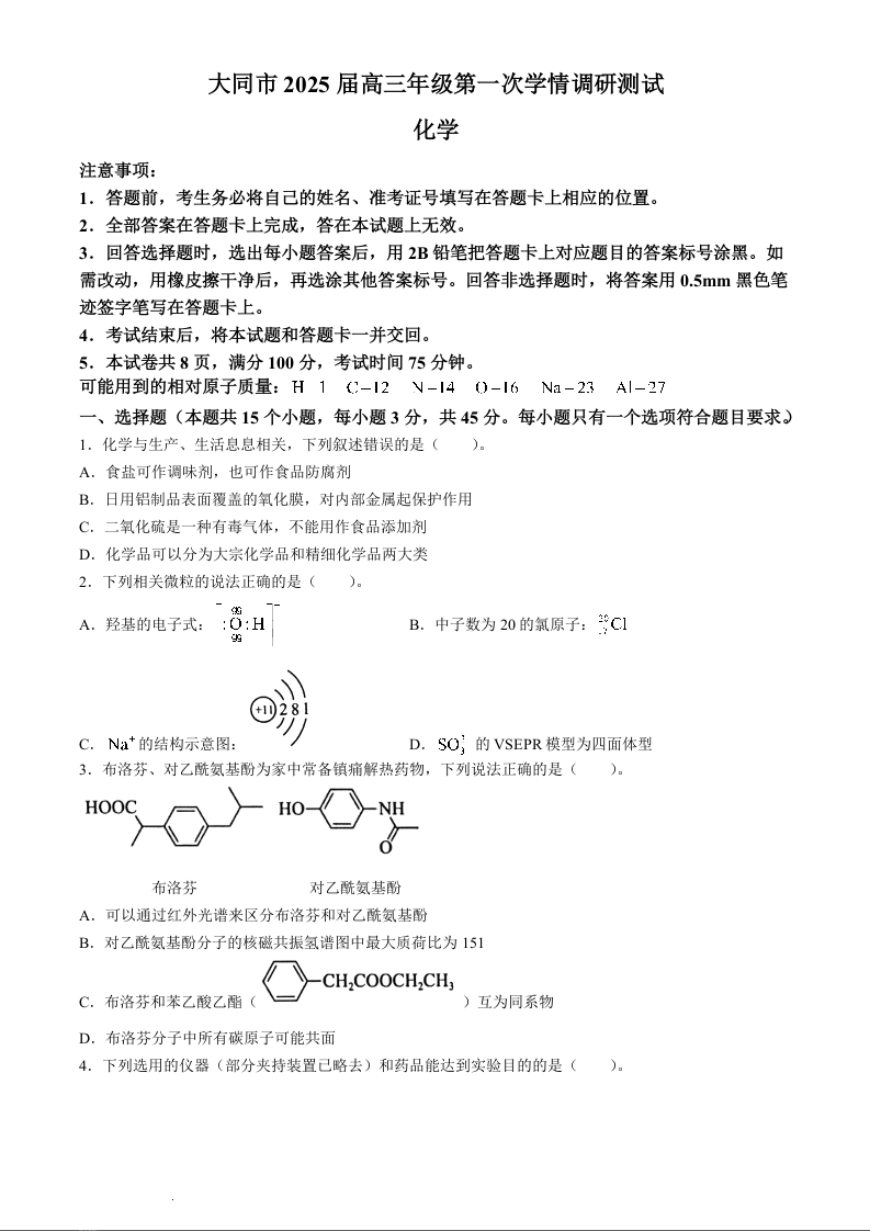 山西省大同市2025届高三年级第一次学情调研化学