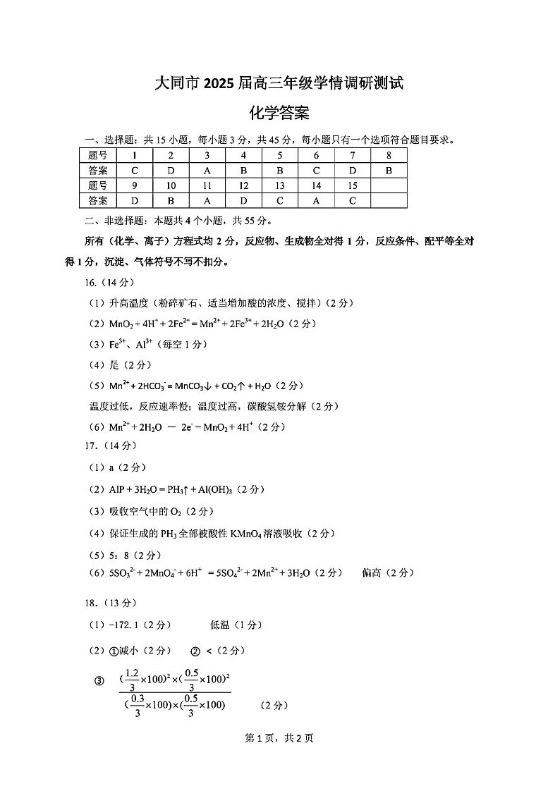 山西省大同市2025届高三年级第一次学情调研化学答案