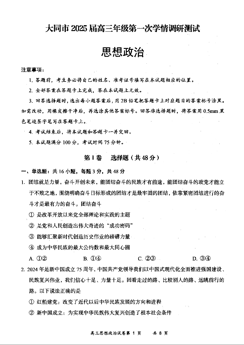 山西省大同市2025届高三年级第一次学情调研政治