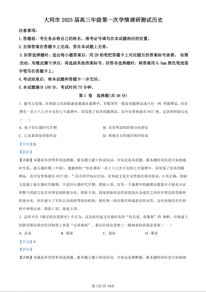 山西省大同市2025届高三年级第一次学情调研历史(精品解析版)